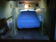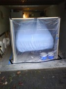 Wenn die Seitenteile fertig sind ,das Fahrzeuf auf die Folie fahren (Fahrzeug sollte trocken sein!) und die Seitenteile aufstellen und mit Querbalken am oberen Rand stützen. Dann das Gerüst mit Folie bedecken und gut verkleben. Zum Schluß noch Behälter für Trockengranulat rein stellen ein Hygrometer gut sichtbar montieren und alles gut verschließen.